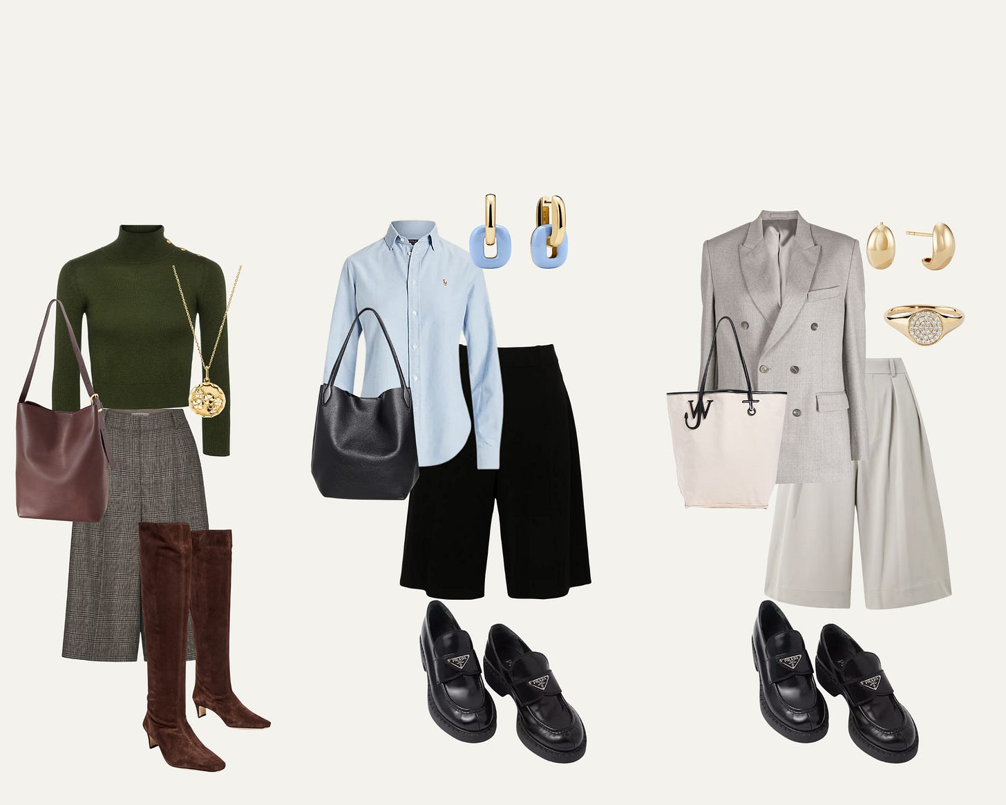 Outfit 2: Polo oxford shirt, Vince shorts, Madewell tote, Prada loafers, Mejuri earrings
